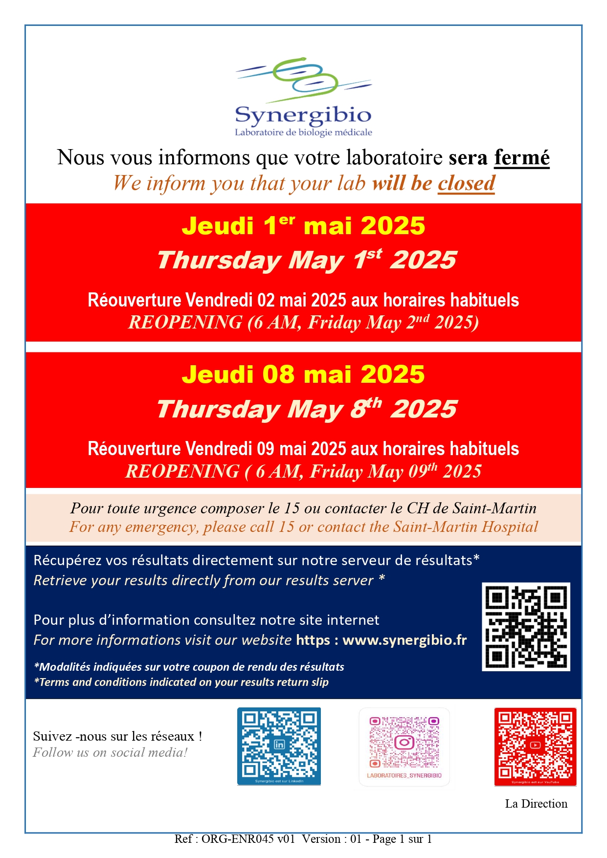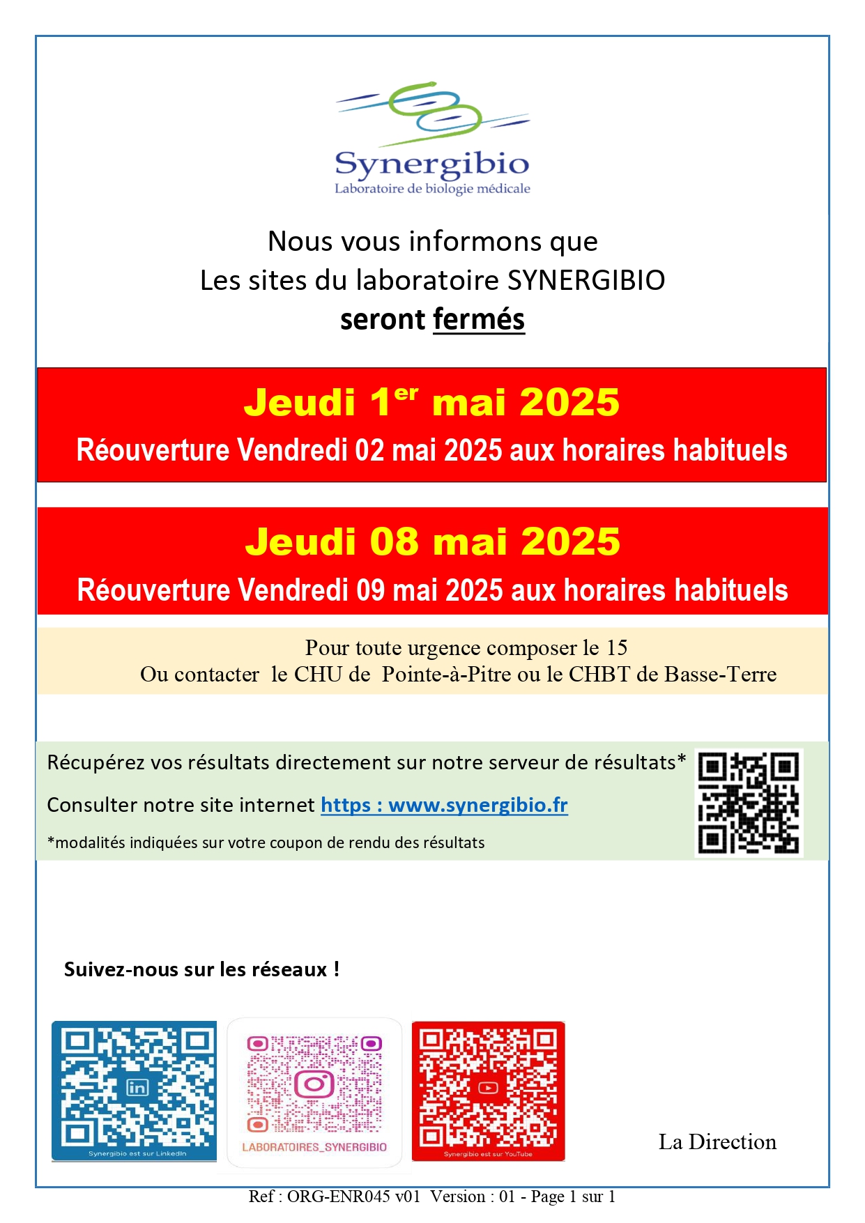 Fermeture de tous nos sites jeudi 01/05/2025 et jeudi 08/05/2025